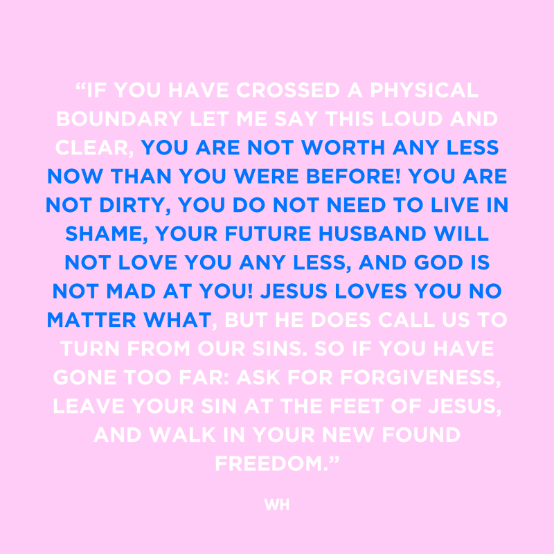 - If you have crossed a physical boundary let me say this loud and clear, YOU ARE NOT WORTH ANY LESS NOW THAN YOU WERE BEFORE! YOU ARE NOT DIRTY, YOU DO NOT NEED TO LIVE IN SHAME, YOUR FUTURE HUSBAND WILL NOT LOVE YOU ANY LESS, AND GOD IS NOT MAD AT YOU! Jesus loves you no matter what, but he does call us to TURN from our sins. So if you have gone too far: ask for forgiveness, leave your sin at the feet of Jesus, and walk in your new found freedom. 2 Corinthians 5:17 says, "Therefor, if anyone is in Christ, the new creation has come: The old has gone, the new is here!" Jesus has forgiven you, he says after repentance he has no recollection of our sins. WALK IN THAT FREEDOM!
